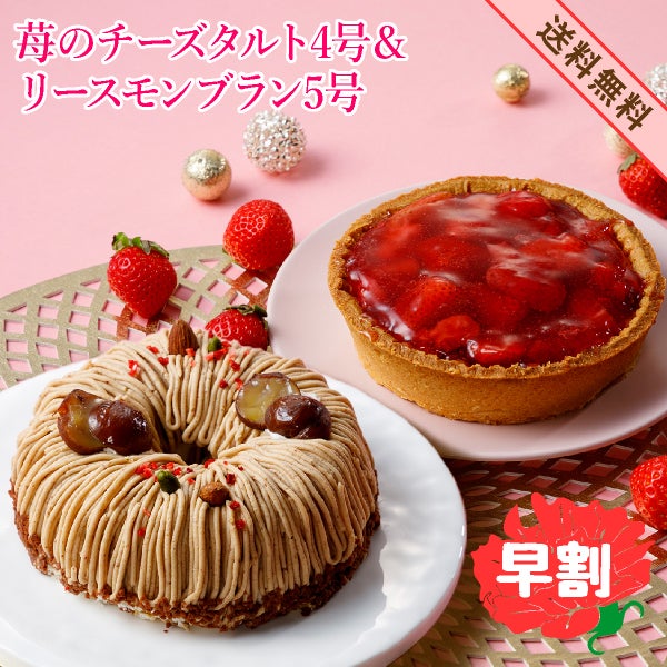 他の画像を見る 【早割】4/25-5/20お届け 母の日 ツインケーキセット リースモンブラン 5号 & ごろごろ苺のチーズタルト 4号 (おのし・包装・ラッピング不可) 定価 ¥ 7,200 のところ 4月25日9:59まで早割 ¥ 6,980 税込 販売期間 2026/03/21 10:00 〜 2026/05/15 9:59 詳細を見る お気に入りに登録する