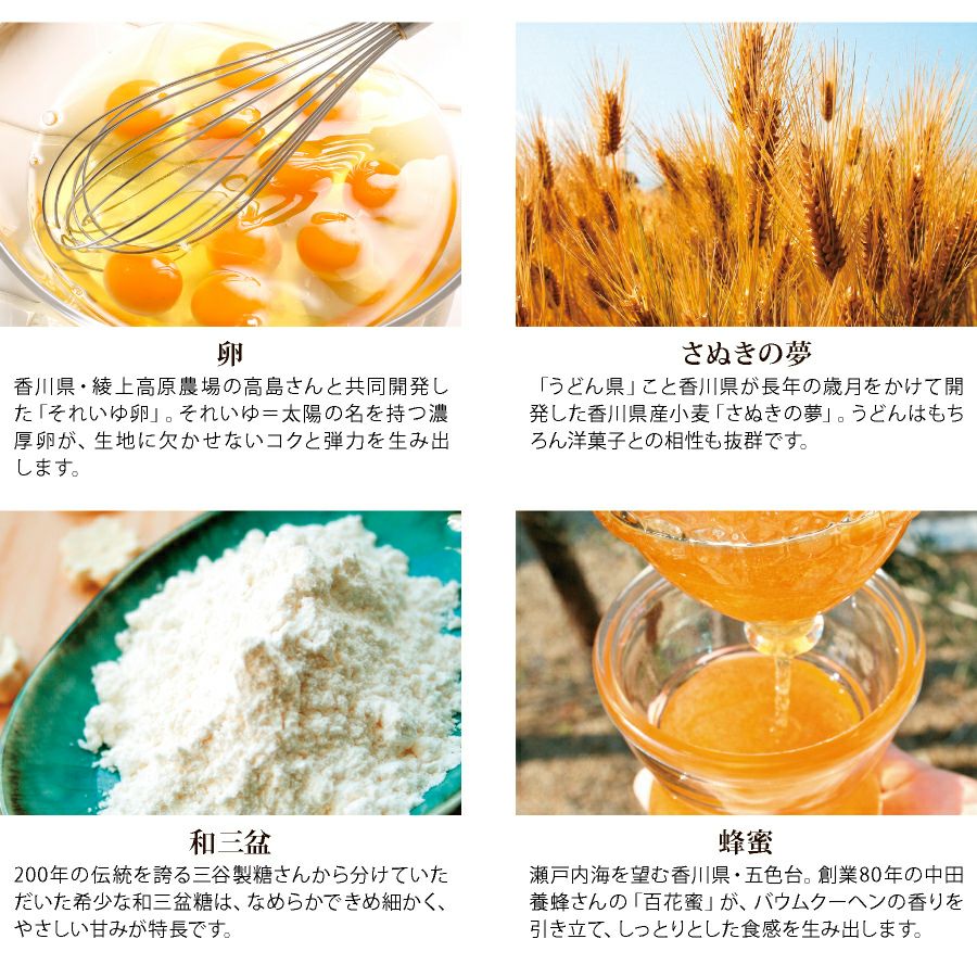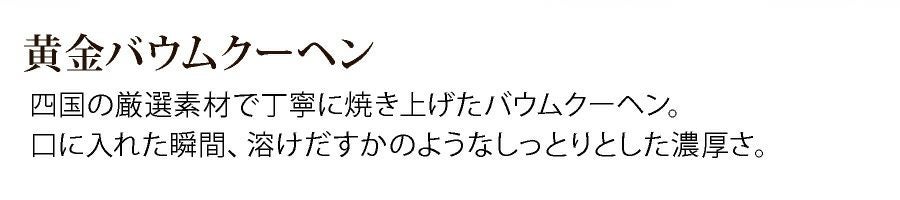 他の画像を見る 黄金バウムクーヘン(Sサイズ) 価格 ¥ 1,404 税込 オンラインショップ会員特別価格 ¥ 1,362 税込 SmaSTATION!、ヒルナンデス!でご紹介いただきました。四国の素材がギュッ♪濃厚しっとり 詳細を見る お気に入りに登録する