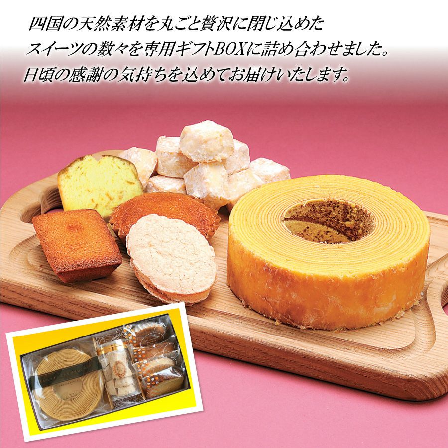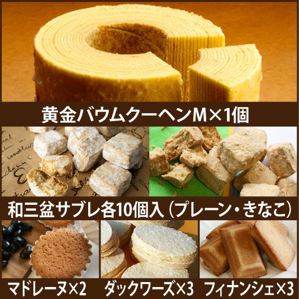 他の画像を見る 黄金バウムクーヘンアソートギフトBOX(B006) 価格 ¥ 6,264 税込 オンラインショップ会員特別価格 ¥ 5,638 税込 黄金バウムクーヘンを始め四国の厳選素材を使ったスイーツの詰合せ 詳細を見る お気に入りに登録する